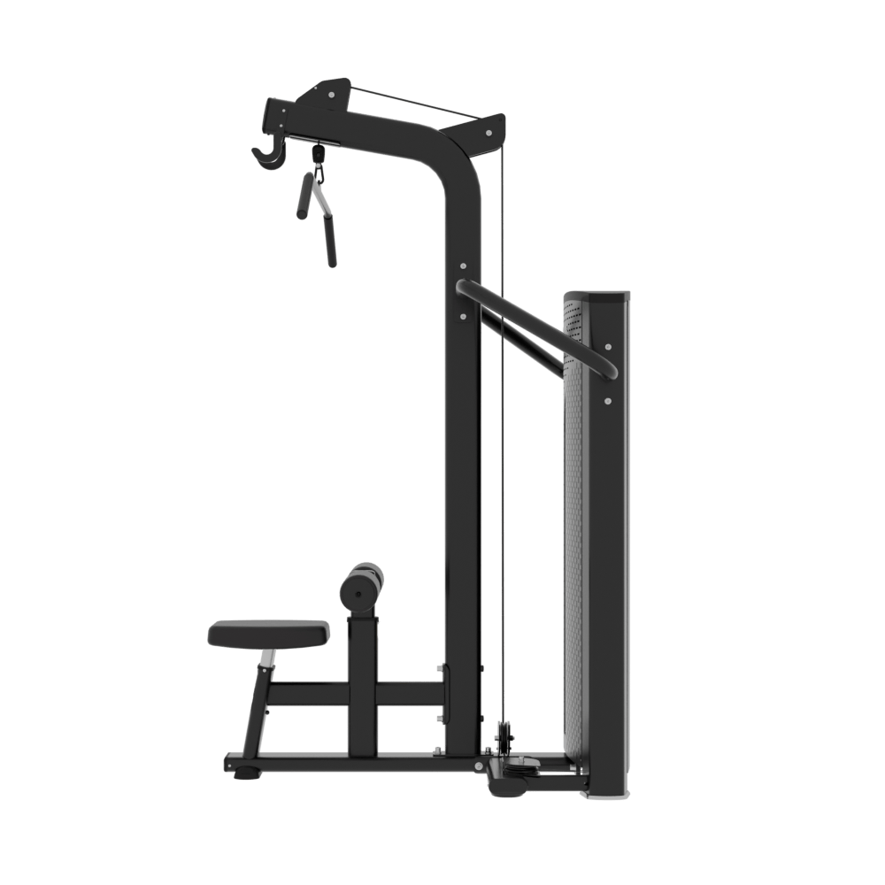 La máquina selectorizada de jalón al pecho es un equipo de musculación profesional diseñado para trabajar de forma segura y eficaz los músculos de la espalda, especialmente el dorsal ancho, los romboides y los bíceps. Gracias a su movimiento guiado y su relación de transmisión 1:1, permite una carga directa y uniforme que favorece la correcta ejecución del ejercicio sin comprometer las articulaciones. Su estructura robusta y su diseño ergonómico la convierten en una opción ideal para gimnasios, centros deportivos y espacios de entrenamiento intensivo.